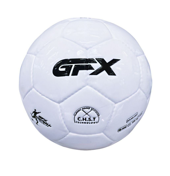 The GFX-114 B is a classic white football designed for general play. Its clean aesthetic is highlighted by bold black graphics, including the prominent GFX logo and the circular "CLASSIC HAND STITCHED TECHNOLOGY (C.H.S.T.)" seal. This seal is a key indicator of its construction.