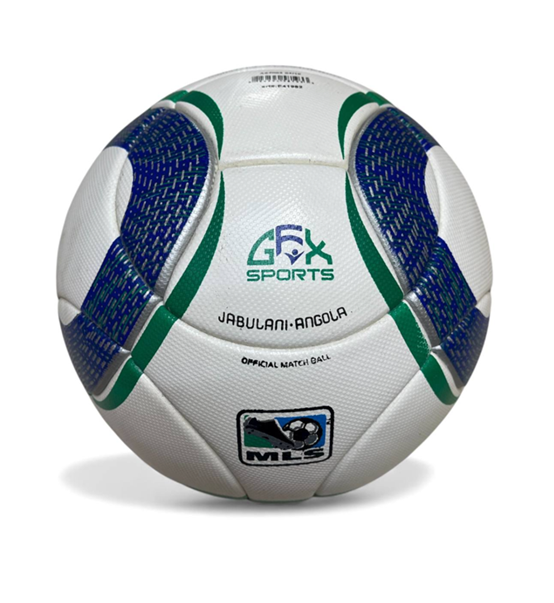This is a white soccer ball with green and blue accents. It features a unique panel design with textured blue sections. The "GFX SPORTS" logo is prominent, along with "JABULANI ANGOLA" and "OFFICIAL MATCH BALL" text.