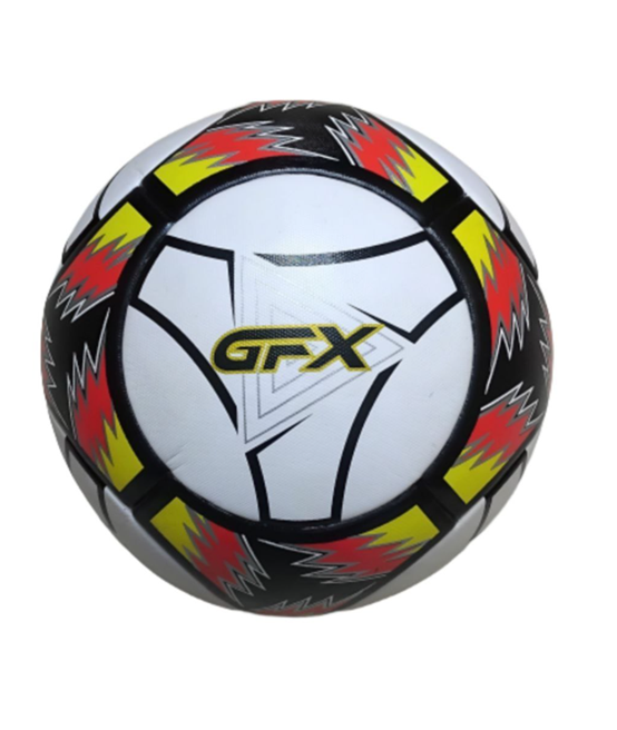 The GFX-96 is a Size 5, four-layer, durable synthetic leather soccer ball made in Pakistan. It features a high-impact, dynamic red, yellow, and black graphic over a white base and is designed for adults and youth players (13+) for general training and recreational matches.