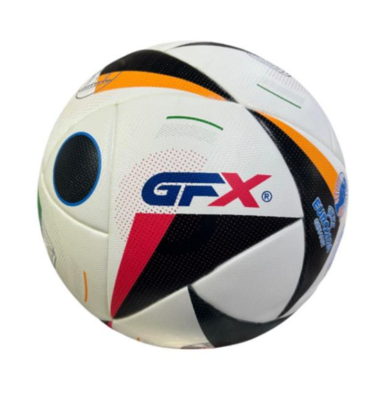 This is a size 5 GFX Euro 2024 football. The ball features a predominantly white surface with a dynamic design incorporating black, orange, and red colored panels and accents. The outer shell is made of durable polyurethane (PU), indicated by "Gf-PU-24", and constructed with a three-layer design for enhanced feel and performance. The panels are machine-stitched for durability, and the ball utilizes a multi-panel configuration.