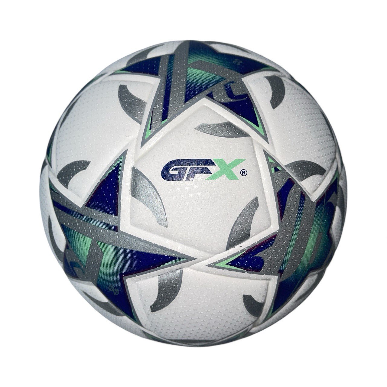 The GFX-7050 is a training and recreational football designed for general-purpose use. It features a similar geometric multi-panel design with a high-visibility, modern aesthetic. The ball has a white base and is decorated with a vibrant, eye-catching graphic pattern that incorporates blue, green, and silver/grey and other mix color star-like.