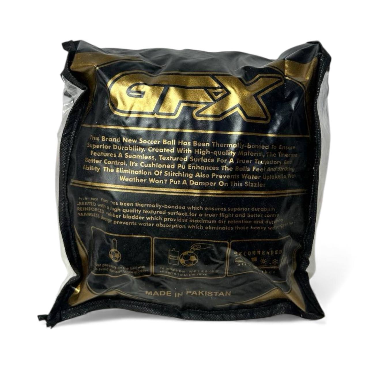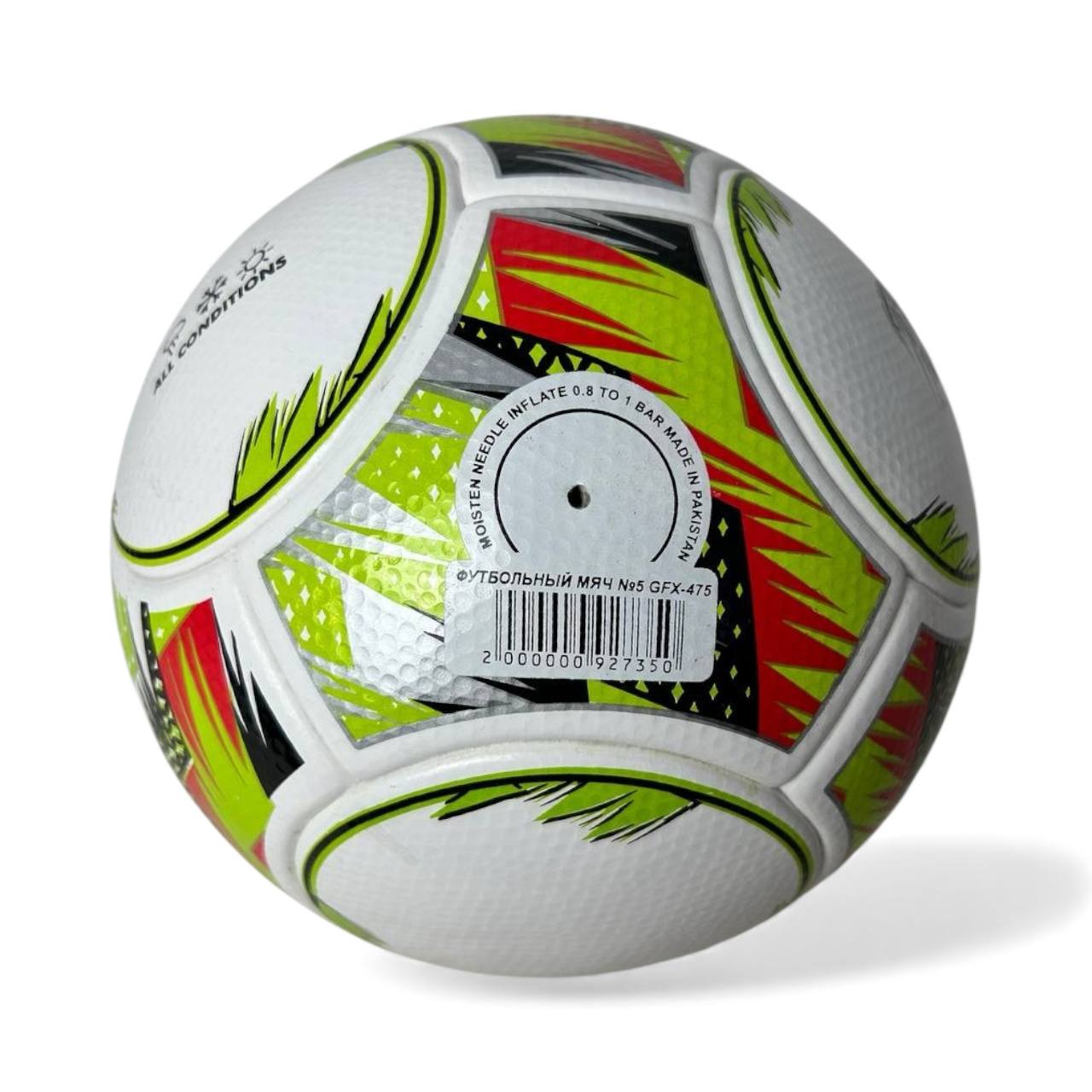 This is a GFX-branded soccer ball, model GFX-475. It features a modern and vibrant design with a white base and panels of neon yellow-green, red, and black. It is a Size 5 ball, the standard size for adult players. Its country of origin, Pakistan.