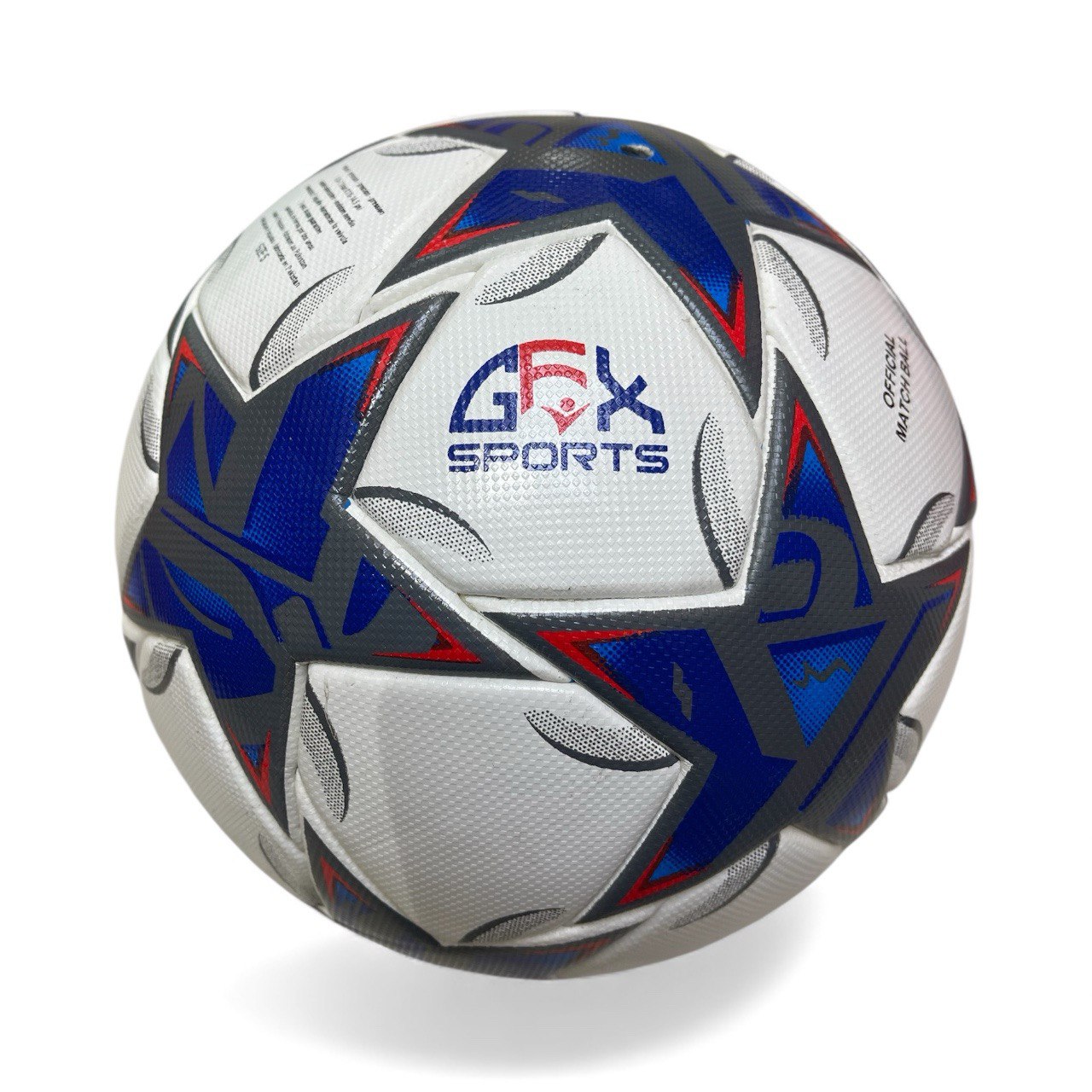 This soccer ball is a well-designed piece of sports equipment with a focus on visibility, durability, and performance. Its classic white background, combined with striking blue and red accents, makes it visually appealing. The use of synthetic leather and a machine-stitched construction ensures its durability. It's designed for optimal grip and control during play.