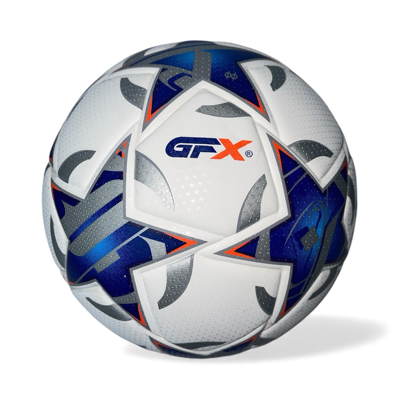The GFX-7070 is a Size 4 soccer ball made by GFX, designed for youth players (ages 8-12) or potentially for futsal/indoor training. Its design, explicitly noted as (Bouncing), suggests it is engineered for a lively rebound and general match play. Aesthetically, it features a white, synthetic leather casing (durable PU) with a striking geometric design in navy blue, green, and silver, often incorporating a prominent star pattern.